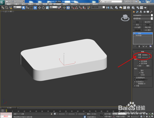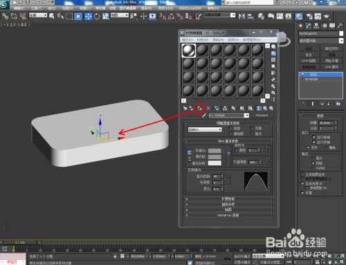 选中矩形图案,点击【点窜】-【挤出】,挤出数目设置为:30,完当作圆角矩形模子的建造。选中模子,点击【材质编纂器】,为模子附加一个金属材质球(如图所示);