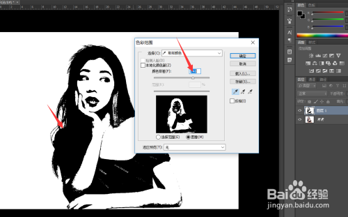 我们点击吸督工具,吸收画面中的黑色,然后点调整颜色容差,让其将黑色部门全数选中,然后点击确定。