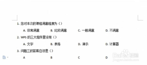 在WPS中,打开一份文字文档,我们需要达到这样的结果,三道题四个选项谜底对齐呈现。