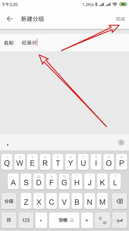 然后在弹出的新建分组页面中,我们设置新的分组名称,最后点击完成按钮就可以了