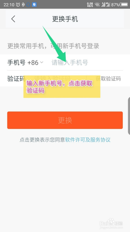 收到短信后,填写验证码,点击改换,点窜手机号。如图所示