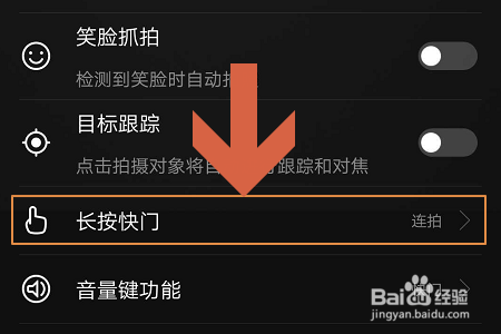 系统默认的长按快门有两个感化,一是连拍,别的一个功能则是锁定焦距,我们点击进入将其切换为“连拍即可”,如下图所示...