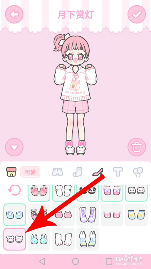 打开外衣界面点击带有草莓装扮的白色外衣,然后在袜子界面点击带有蝴蝶结的白色短袜,位置见下图