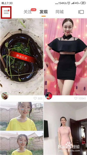 有两个方式可以找到保藏的音乐,第一个是在快手里点击左上角的【三】。