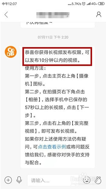 首先我们需要确保本身获得了10分钟的长视频权限,具体的可以在私信的快手中看到,若是有的话官方会发动静通知。