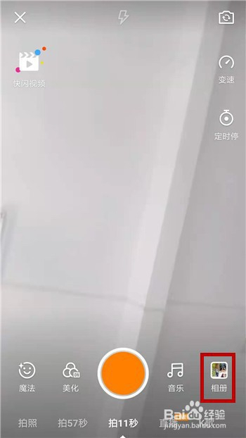 点击后会打开拍摄界面,此时默认的拍摄只有11秒和57秒,长视频只能是上传的,所以点击【相册】。