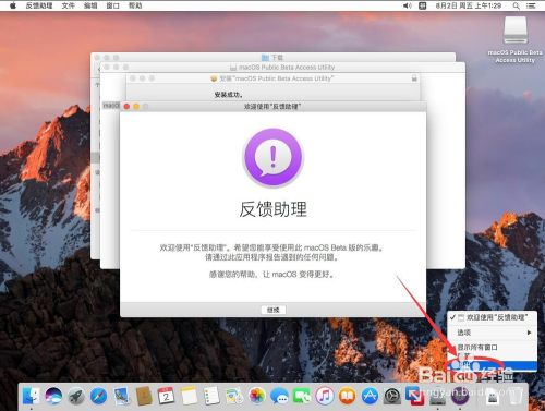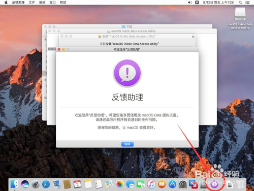 安装过程中会弹出反馈助理,在Dock栏的反馈助理图标上点右键