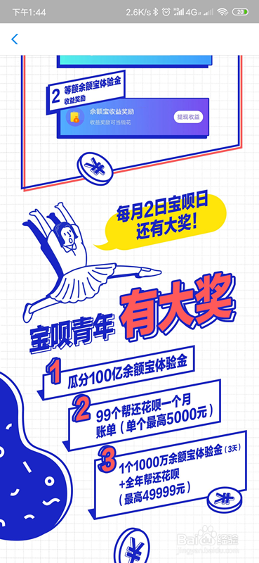 每月完当作每周的四次认证还可以获得三项权益,一是可以瓜分100亿余额宝体验金,二是可以抽奖花呗免费还,最高4999元。三是抽奖游学之旅。
