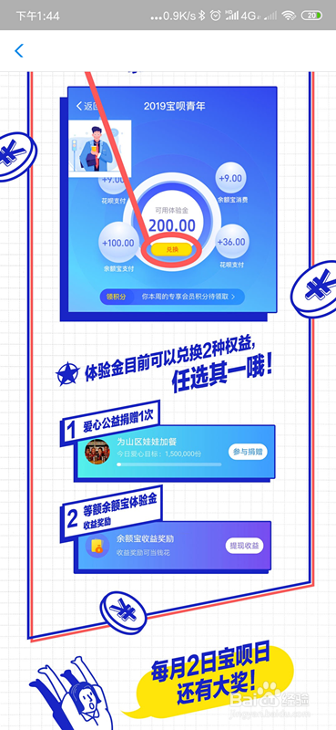 完当作认证后花呗支付所消费的金额会酿成余额宝体验金,满200可以进行兑换一次,体验金可以用来爱心捐募一次,也可以转入余额宝用来赚利钱。