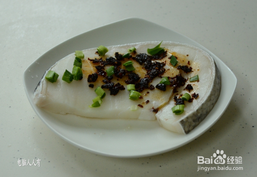 腌制半小时之后,再将鱼块翻个面,姜片放在底部,在鱼块上面撒上豆豉辣椒酱和大蒜叶子。