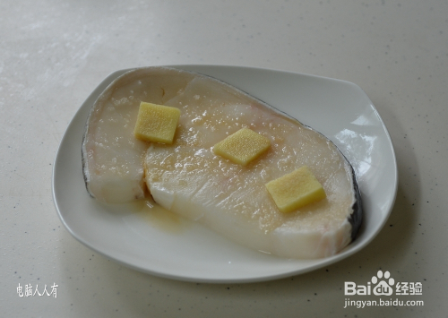 再将盐平均地撒在鱼块上,洒上黄酒,然后利用姜片将鱼块擦拭一下,搁在上面。