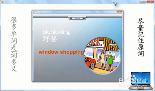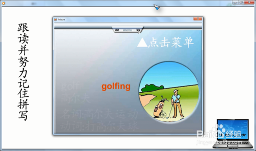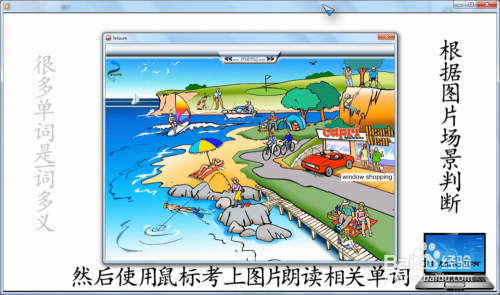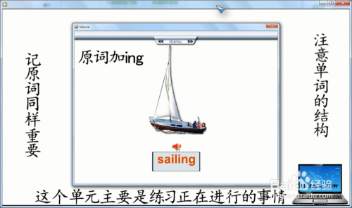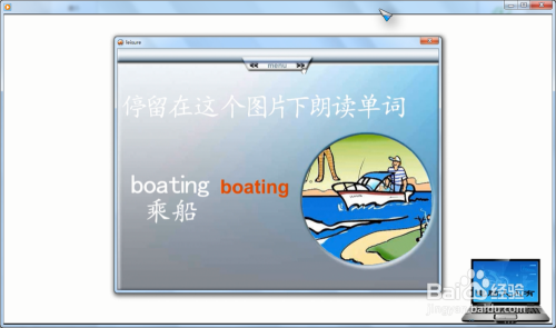 进入本家儿菜单Weekend away(周末外出)→点卡分项菜单Things to do(要做的事)→再点击右上方的菜单进入下一步→此时会主动浏览图片(不雅察本身熟悉哪几个单词),最后,逗留在某一个图片,并朗读做这个工作的单词boating(荡舟、搭船)→可以多次点击操练听力,并注重如何拼写(后面的拼写、默写需要)