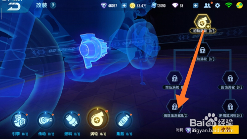 之后我们改装涡轮,我们点左边这列,一共需要加15点,这样可以让赛车有更大的动能,如图所示。