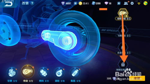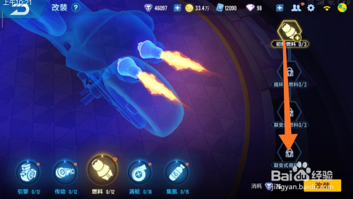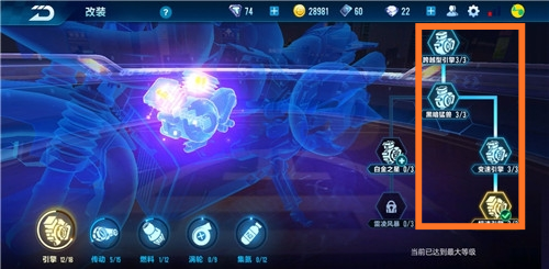然后我们先改引擎,我们本家儿要将右侧的先加满,提高引擎的机能,如图所示。