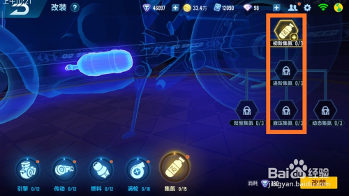 最后我们改装赛车的集氮,我们全数加满即可,这样氮气收集更快,并且利用时候更长。我们改装的时辰本家儿要先加引擎和燃料,选择中心这列。如图所示。