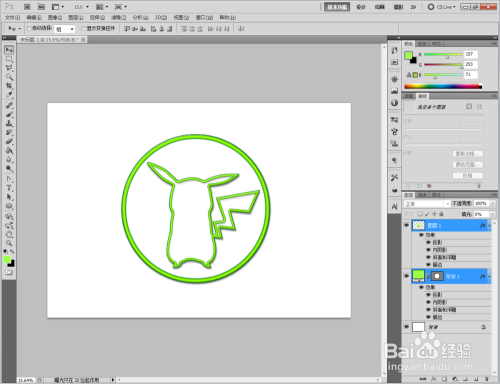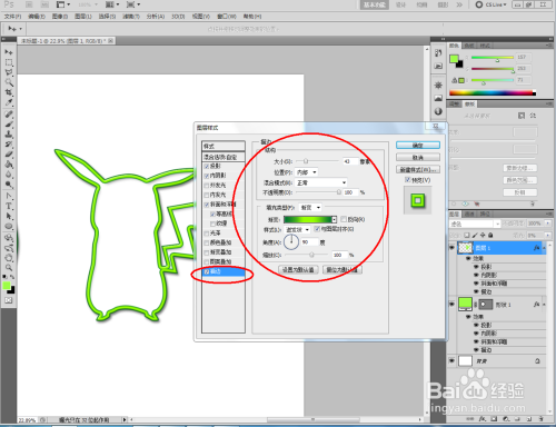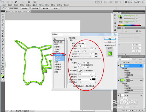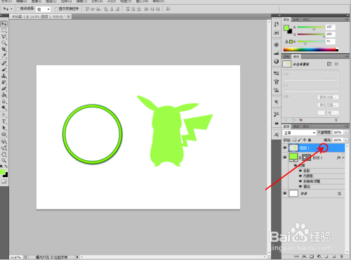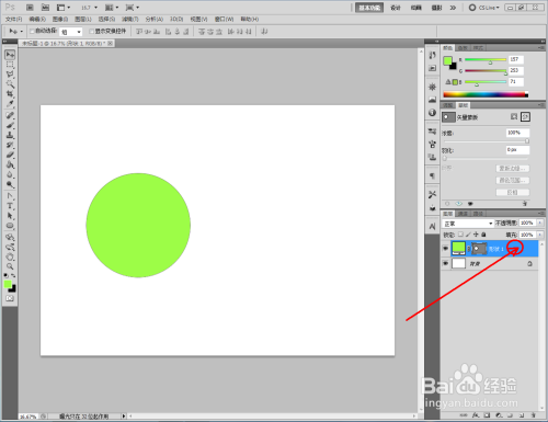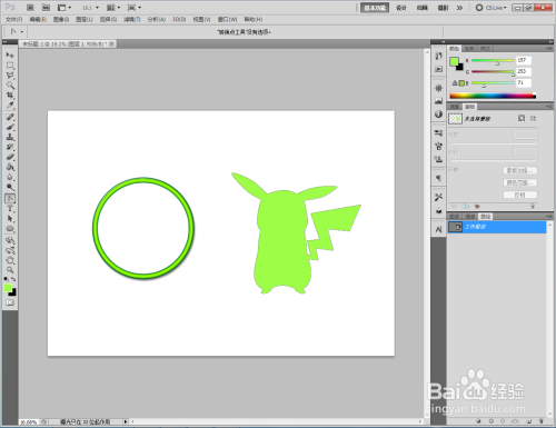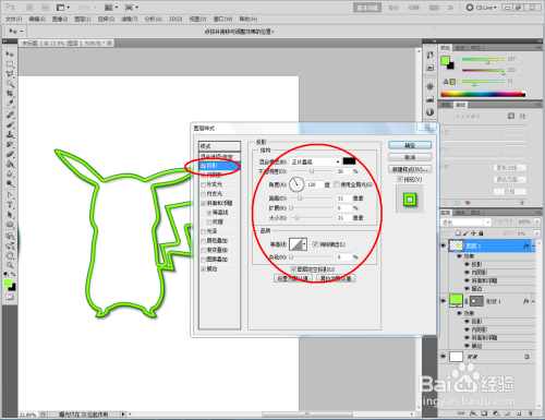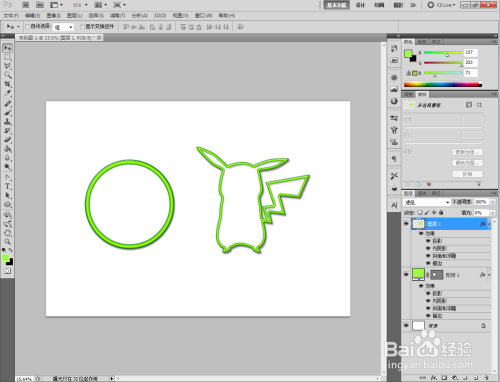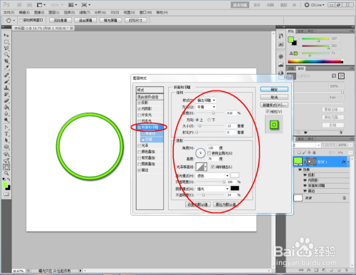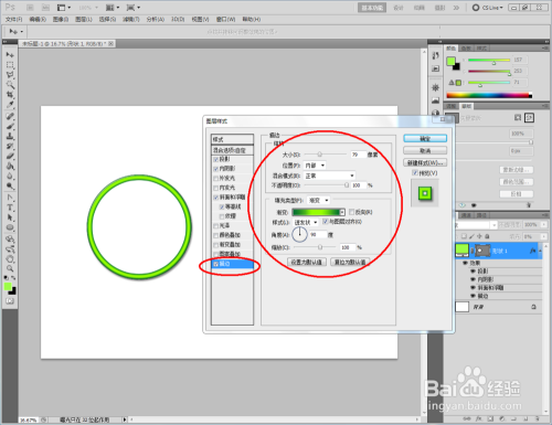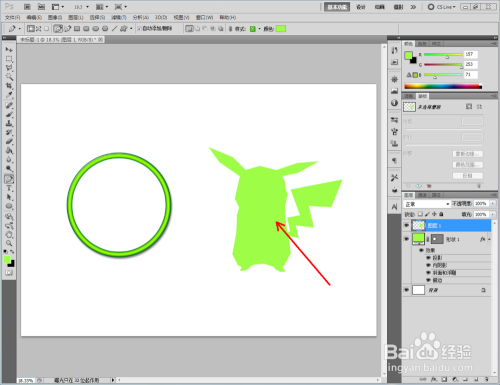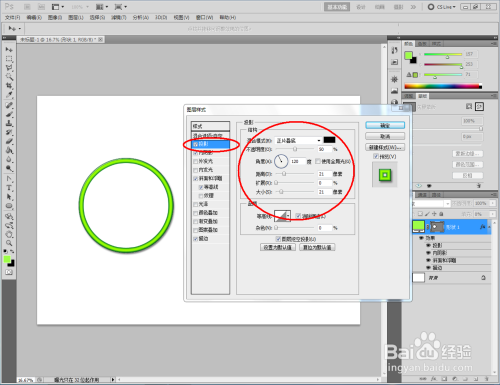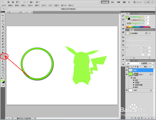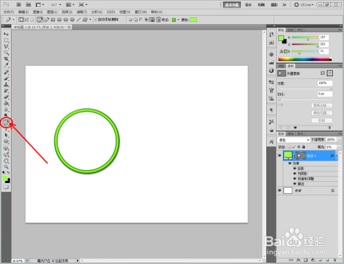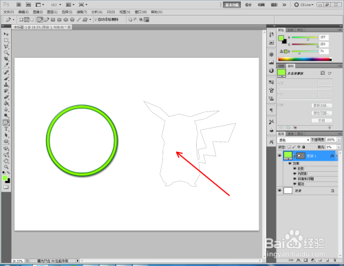 点击【卵形东西】,点击【外形图层】并将颜色设置为:绿色,按住键盘【Shift】键不放,鼠标拉动绘制出一个法则圆形(如图所示);