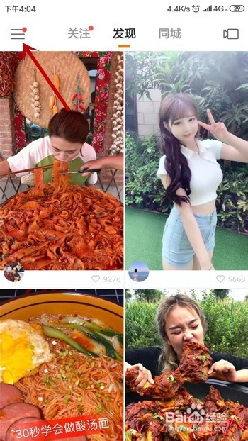 返回到快手的视频界面后点击左上角的【三】按钮。