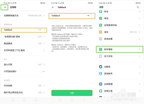 3、开启TalkBack功能后,想进行操作时需要先点击,然后呈现绿框后再持续点击两次才能进行下一步操作,假如需要上下滑动时需要双指在屏幕滑动哦!摆布滑动也是如斯操作。