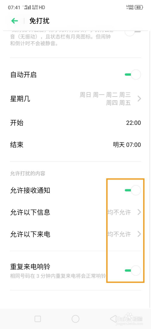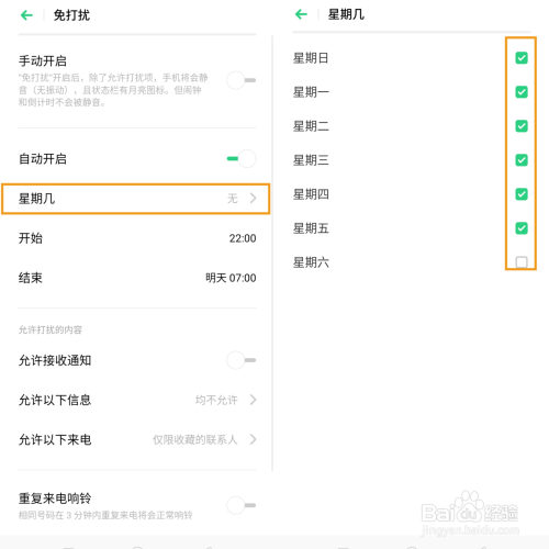3、主动开启免打搅,是在设置特定的时候内会主动启动,可设置一周的内的几天,这样就不消天天去设置了。