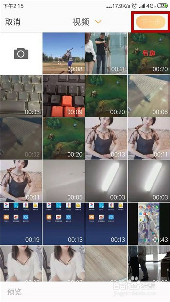 打开手机的视频选择界面后选择视频,选好后点击【下一步】。