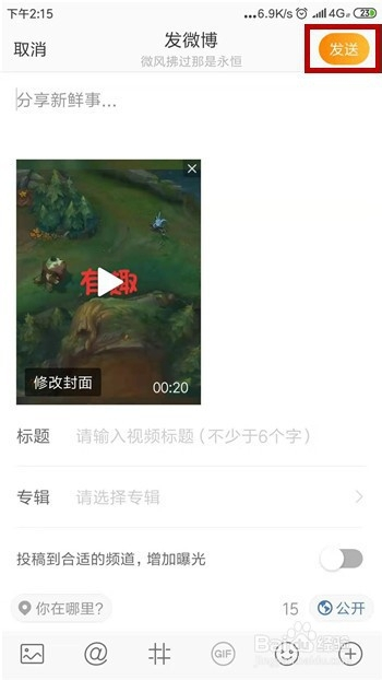 最后就可以输入文字介绍和题目,然后点击【发送】即可上传原画质。