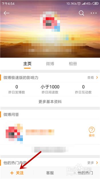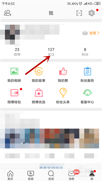 我们在微博的账号处可看到【存眷】,点击打开存眷界面。