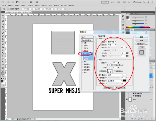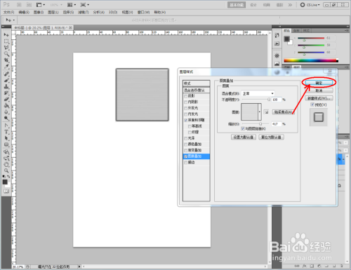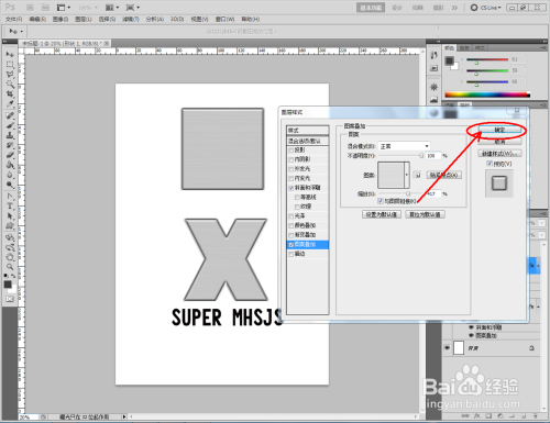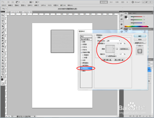 鼠标双击图示空白区域,弹出【图层样式】设置栏,勾选【斜面和浮雕】和【图案叠加】,并按图示设置好对应的各个参数,完当作冲压拉丝金属结果的建造;