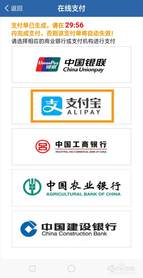 选择在线支付体例,可以选择支付宝,也可以选择某个银行,只要你绑定过网上银行的都可以,我这边选择示例【支付宝】付条目;