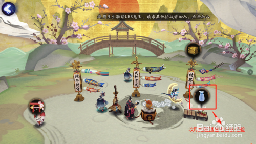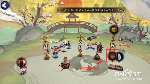 这就是本身结界的页面,可以看到本身已经在寄养中的式神在‘散步’,点击中心的旗杆‘式神育当作’;