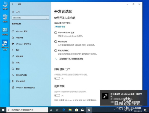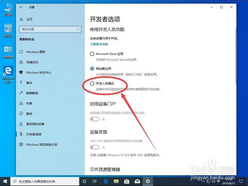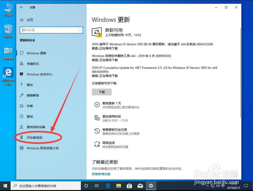 打开更新和平安后,点击左侧边栏里面的”开辟者选项“