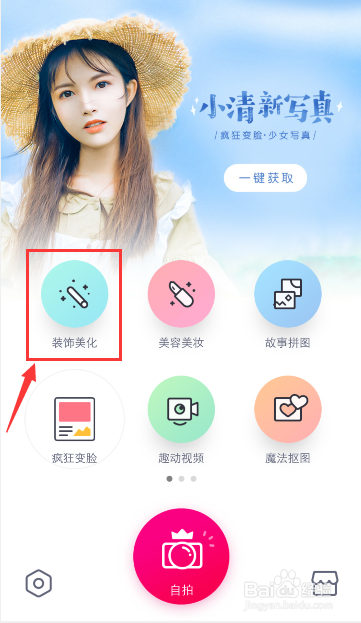 手机下载安装“天天P图”,然后打开它,进入页面,点击“装饰美化”就可以上传你要去水印的图片。