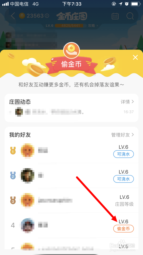 进入老友列表后,找到可以偷金币的老友,点击 偷金币 。