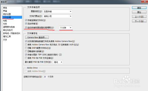 设置主动保留属性,本家儿如果防止文件未保留时系统解体或者软件不正常退出导致文件丢掉。依旧是Ctrl+K打开首选项,点击左侧的文件处置,看到右侧的主动存储恢复时候距离,一般设置为5分钟