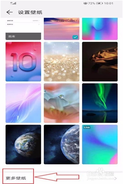 在【桌面和壁纸】页面,再点【壁纸】。接着呈现【设置壁纸】,在该本家儿页的最下方,点【更多壁纸】。