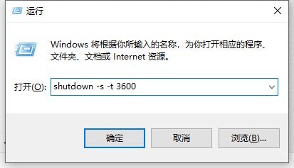 在运行窗口里输入“shutdown -s -t 3600”,此中3600代表3600秒后关机,即1个小时后关机;