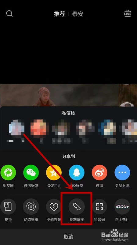 页面别关,切换到抖音短视频上,点击右下角的箭头,在选择 “ 复制链接 ” 。如下图所示。
