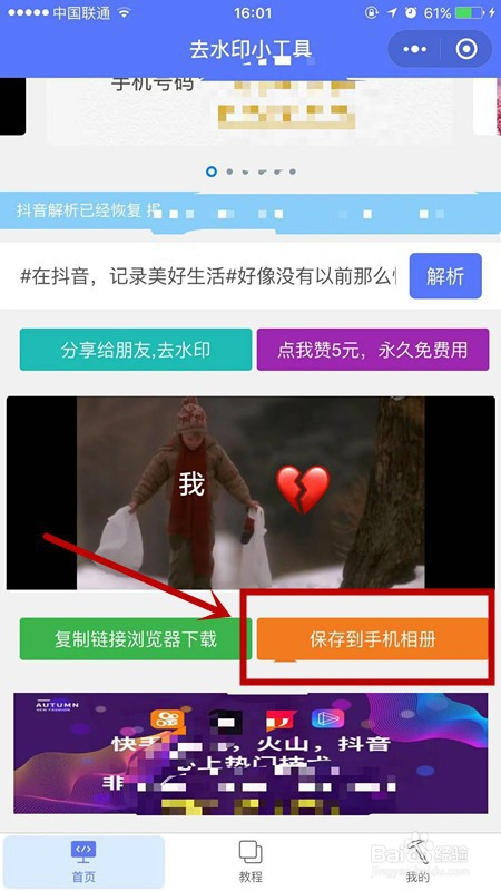 接着点击 “ 解析 ” ,解析完点击 “ 保留到相册 ” 即可。如下图所示。