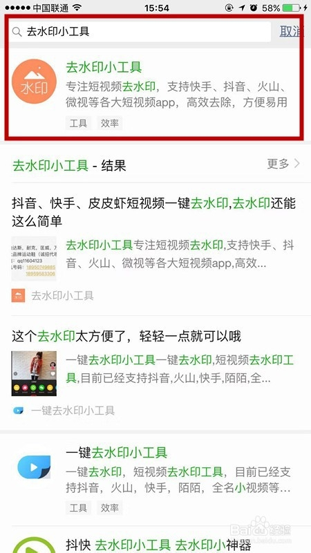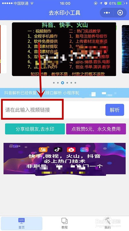 在 “ 搜刮小程序 ” 上输入 “ 去水印小东西 ”,就会显示出一个 “ 请在此输入视频链接 ” 的提醒。如下图所示。