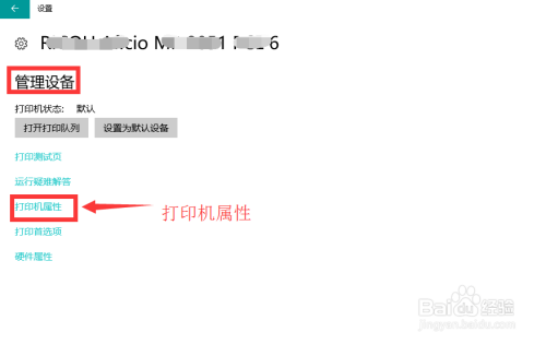在弹出的打印机办理设备页面,点击打印机属性,进入打印机相关信息设置装备摆设。