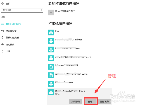 这时我们第一眼看见的是电脑上已经安装的打印机和扫描仪清单,单击一下要共享的打印机,在打印机下方会呈现办理按钮的字样,点击进入。
