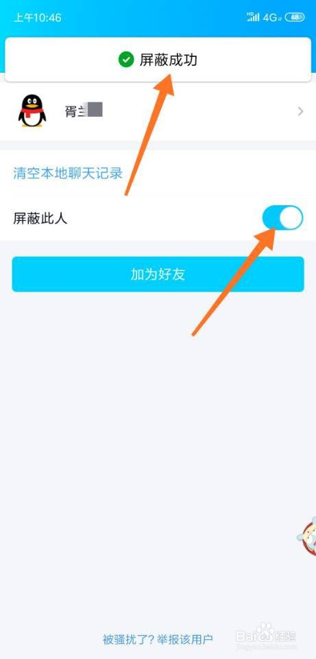 进入聊天设置界面今后,点击按钮-屏障此人,然后提醒屏障当作功,如下图