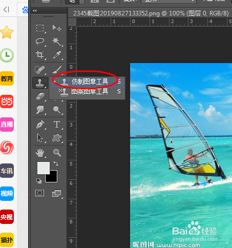 第4个方式,用仿制钤记东西。找到近似于水印四周的图像,然后用手按住alt键,拔取可以置换的图像,然后松开alt键,在水印上面进行涂抹,这样就可以去除水印。