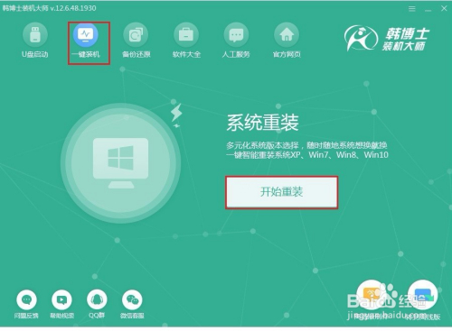 双击打开韩博士,来到韩博士界面后,选择“一键装机”模块下的“起头重装”。