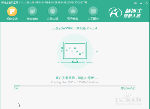 文件下载完当作后,韩博士会对电脑进行摆设安装。摆设完当作后电脑会自行重启,也可以手动选择重启。