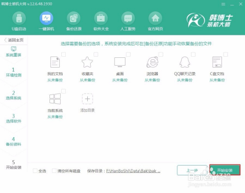 选择备份文件。因为在重装系统的时辰会格局化系统盘上的数据,这个时辰我们就可以勾选需要备份的文件,系统重装后对文件进行还原操作,最后点击“起头安装”。