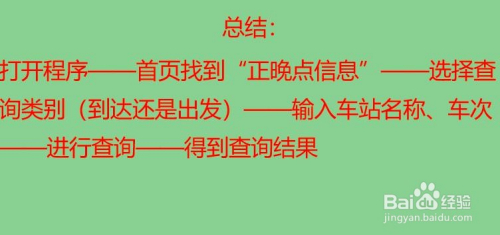 总结:打开程序——首页找到“正晚点信息”——选择查询类别(达到仍是出发)——输入车站名称、车次——进行查询——获得查询成果
