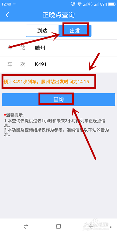 若是想查询滕州站k491的出发信息,直接单击“出发”选项卡,再单击“查询”,就可以获得这趟车次在滕州站的出发信息