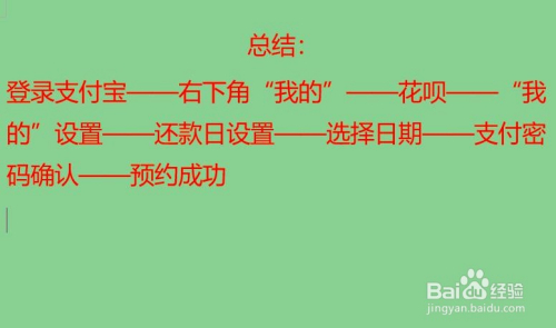 总结:登录支付宝——右下角“我的”——花呗——“我的”设置——还条目日设置——选择日期——支付密码确认——预约当作功