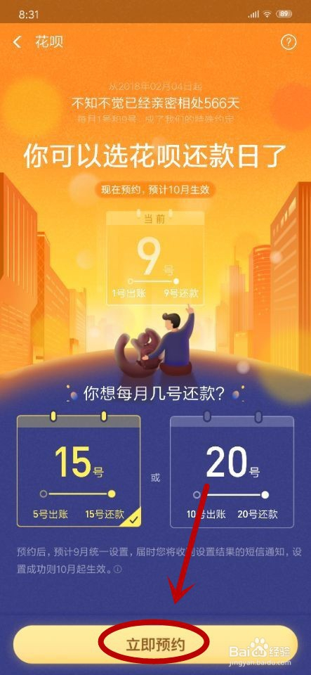 进入“花呗”还条目日设置页面,有两种选项“15号”和“20号”我们可以按照本身发下班资便利还条目的日期来选择,这里我选择“15号”,选择完当作单击“当即预约”