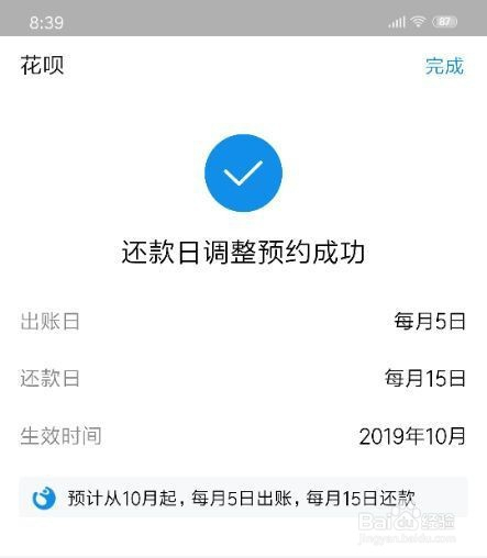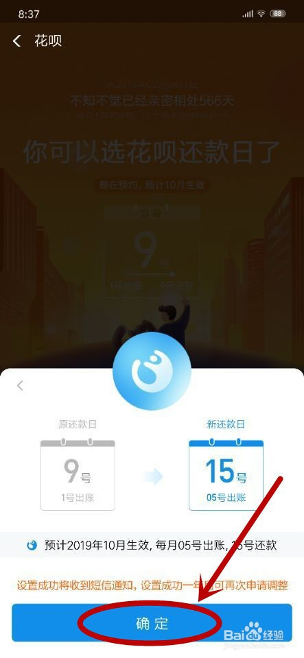新弹出还条目日设置确认页面,会有“估计*年*月生效,每月05号出账,15号还条目”字样,若是认为可以,就点击“确定”。